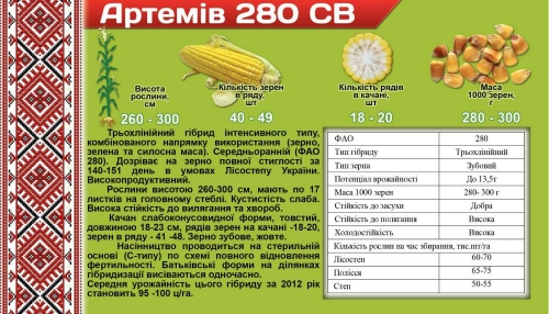 Трьохлінійний гібрид інтенсивного типу, комбінованого напрямку використання (зерно зелена та силосна маса). Середньоранній (ФАО 280). Дозрівае на зерно повної стиглості за 140-151 день в умовах лісостепу України Високопродуктивний.