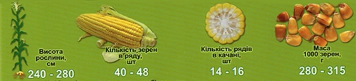 Качан слабоконусовидної форми, довжиною 20-24 см, рядив зерен на качані 14-16, зерен в ряду 40-48. Зерно проміжне, ближче до зубового, жовте.